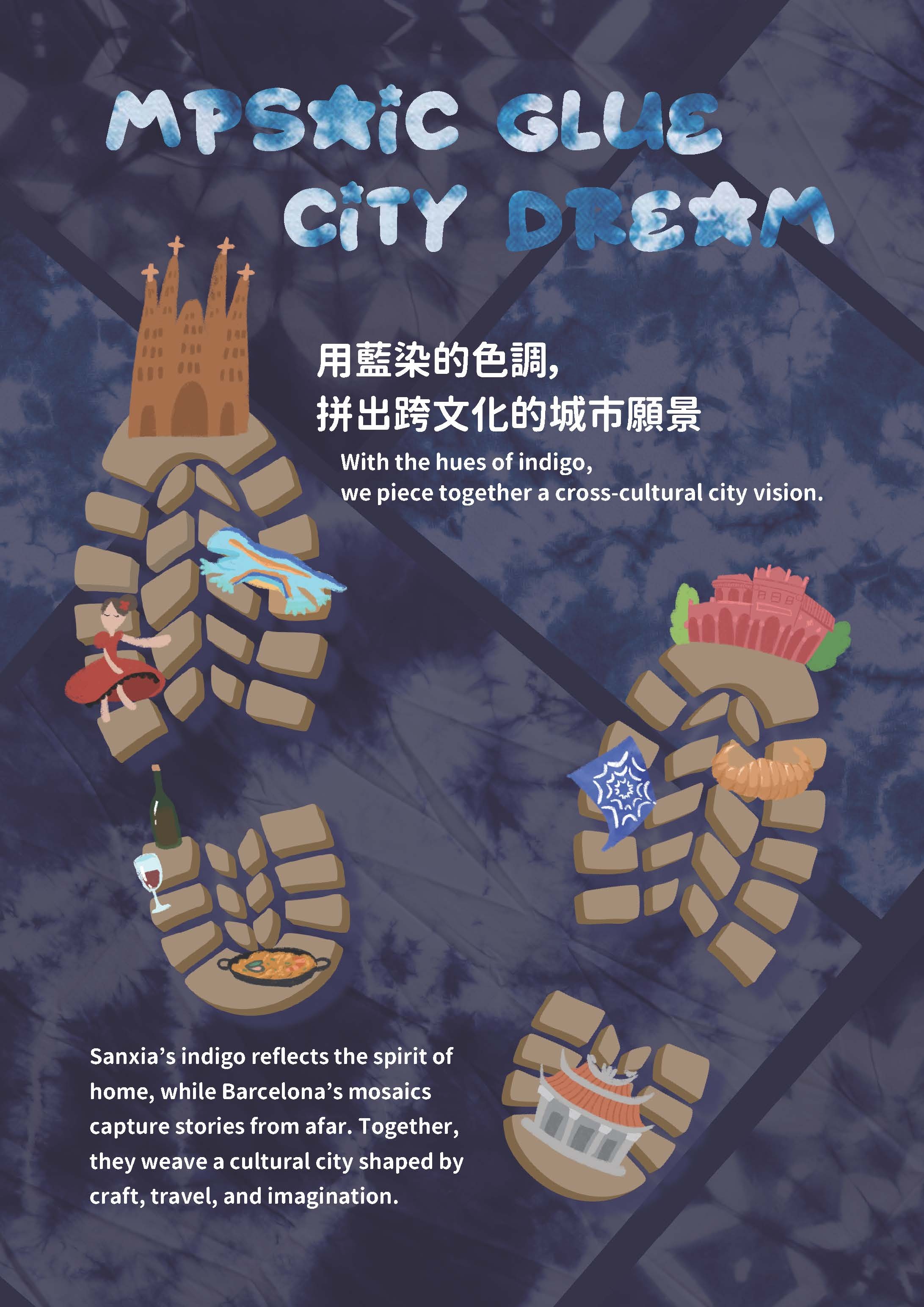 很開心這次海報能得獎,作品以西班牙馬賽克拼貼的鮮明色彩結構,融合三峽在地的藍染與紅磚元素,嘗試讓異國的熱情與台灣的文化底蘊在同一畫面對話。