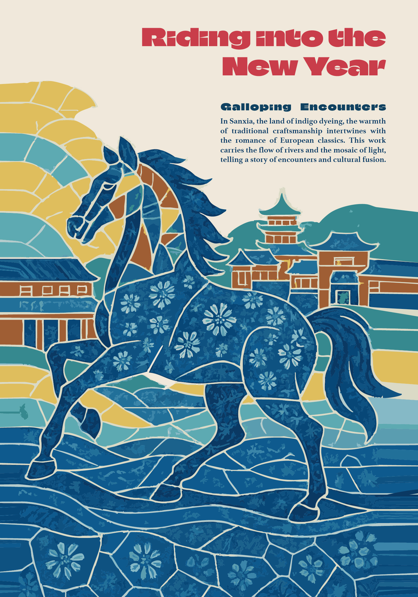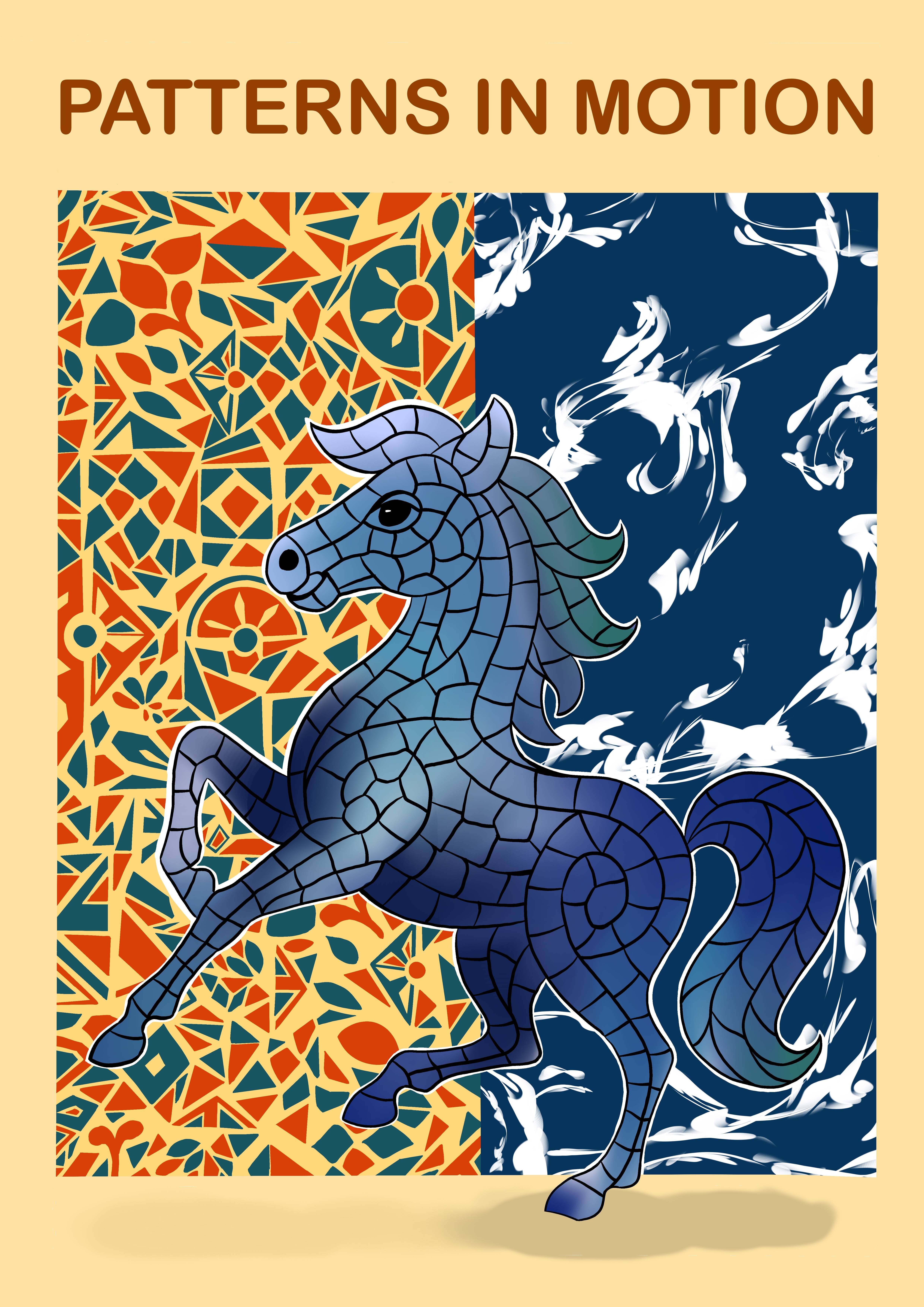 這次能在比賽中獲獎,對我來說是一份難得的肯定。創作的過程中,我嘗試將三峽藍染的文化底蘊與歐洲馬賽克拼貼的藝術語言融合,透過幾何與色彩去詮釋馬年的奔放精神。
