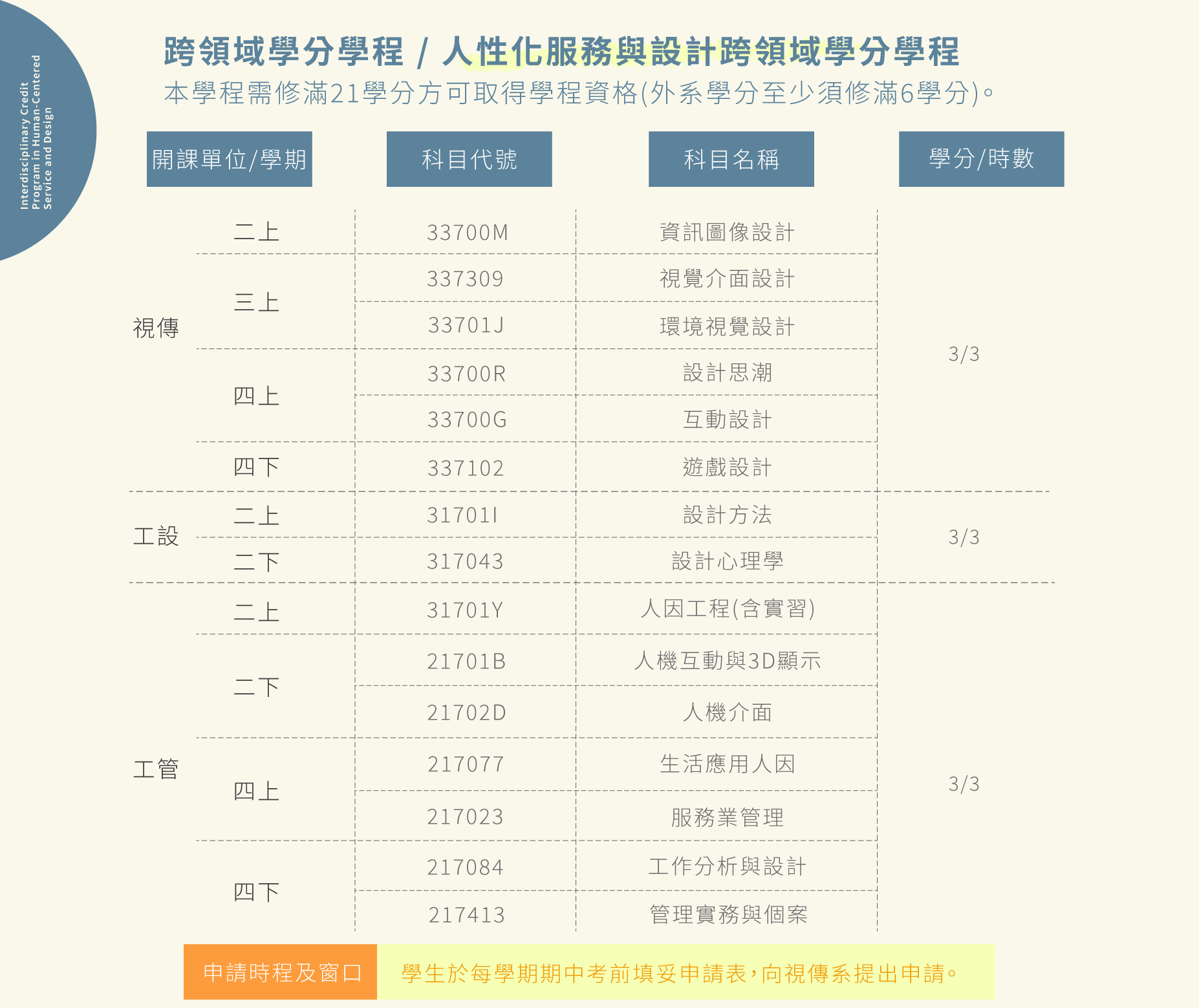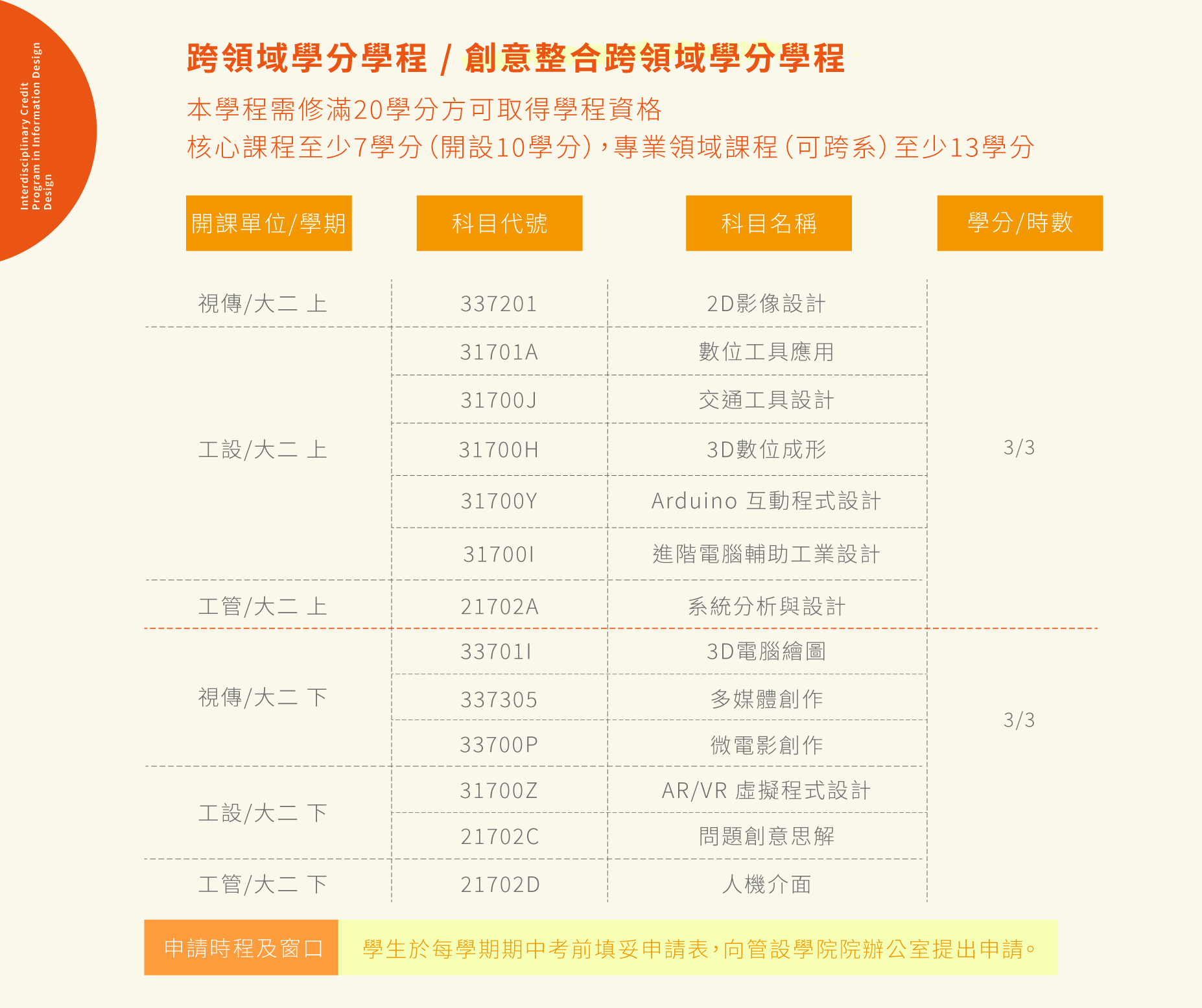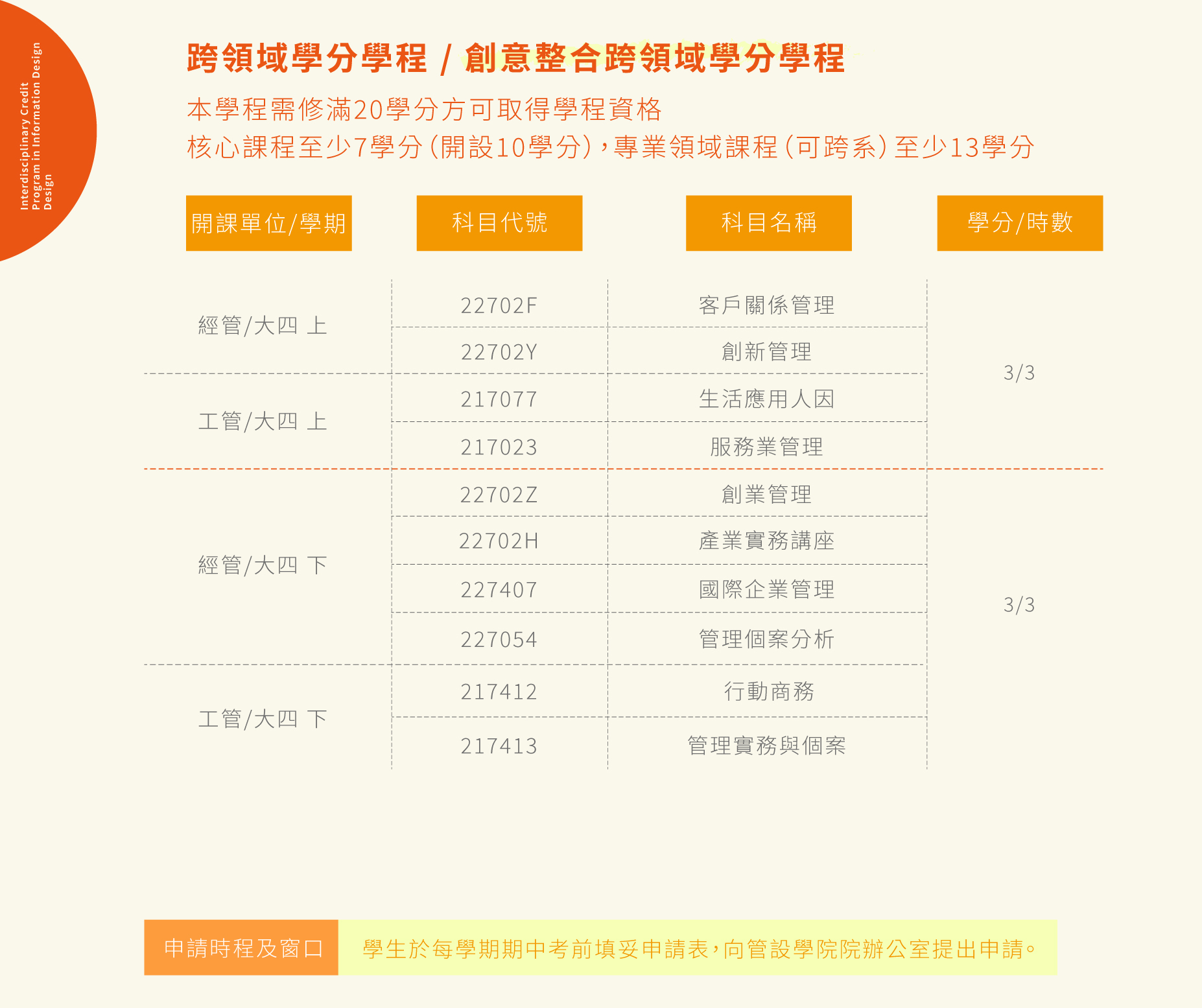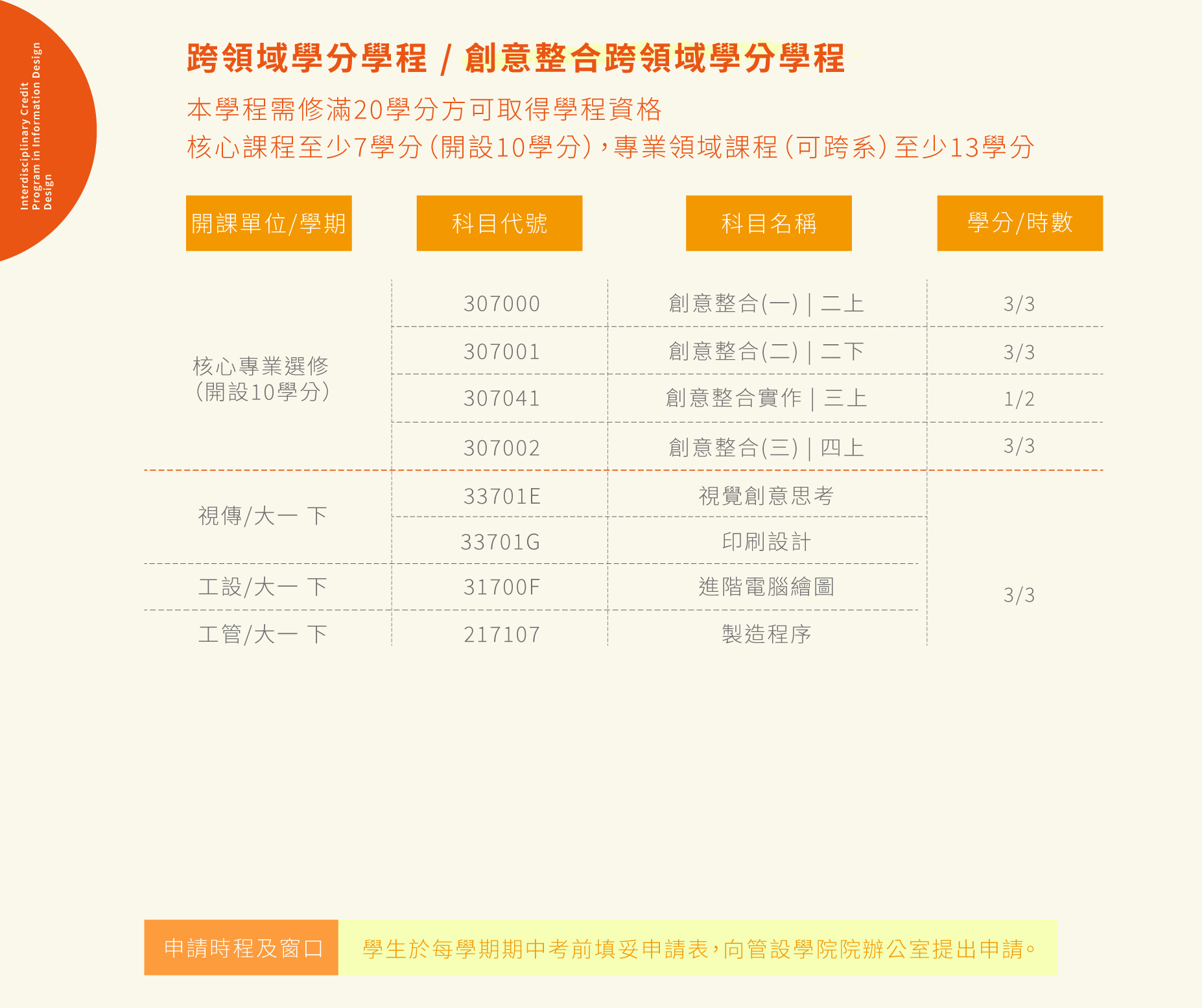 核心課程至少7學分(開設10學分),專業領域課程(可跨系)至少13學分