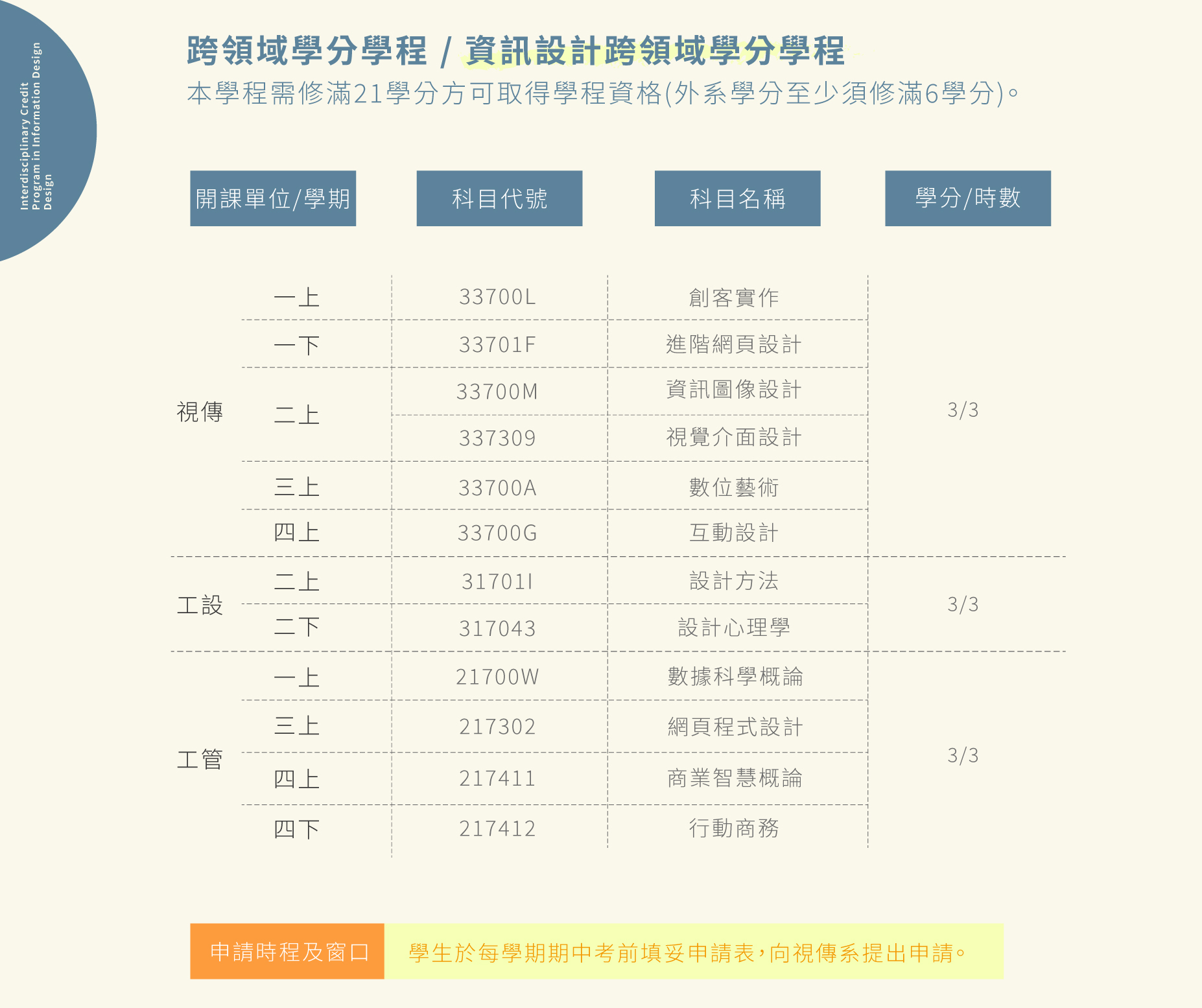 本學程需修滿21學分方可取得學程資格(外系學分至少須修滿6學分)。